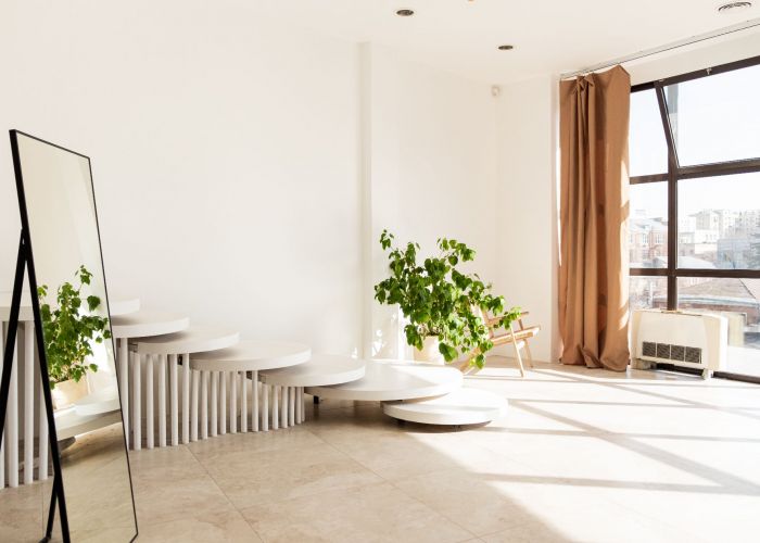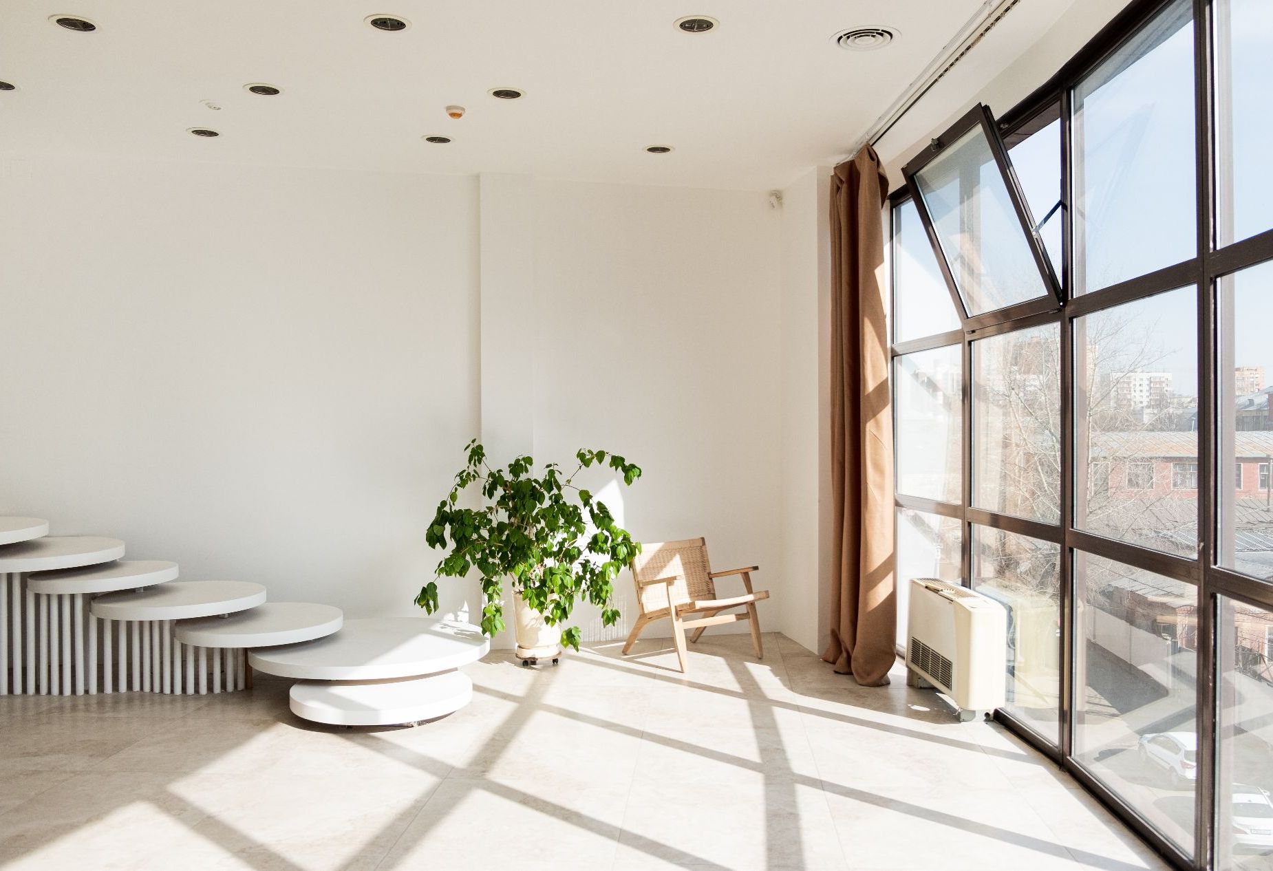 Светлый зал на солнечной стороне, площадью 60 кв. м. Высокие потолки и панорамные окна в пол. Интерьер выполнен в светлых и бежевых оттенках.