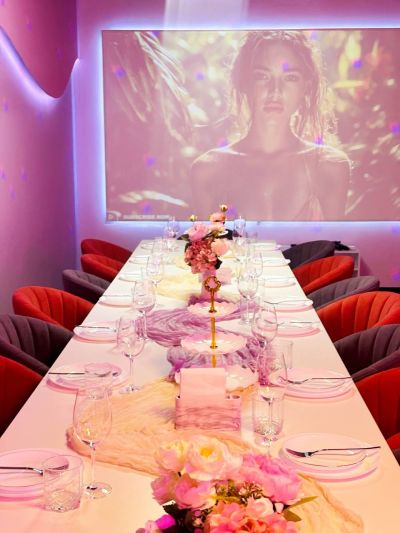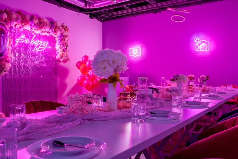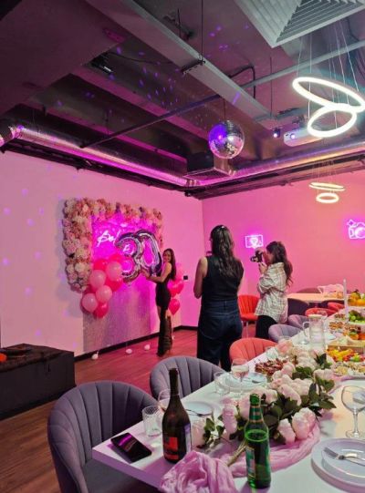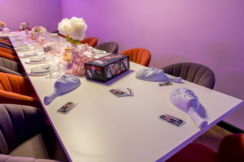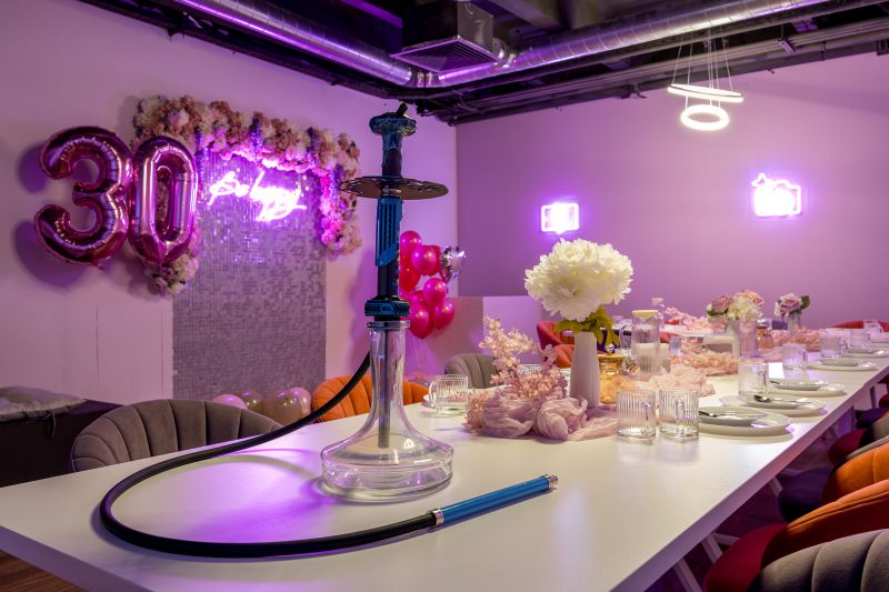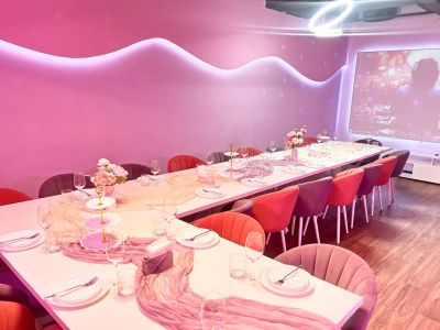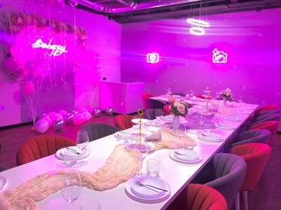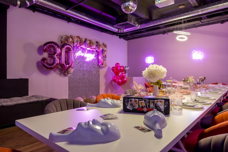 Зал Пёрпл выполнен в стиле современного лофта с глубокой фиолетовой палитрой и акцентным светом. Дизайнерская мебель, стены с элементами декора в пурпурных тонах и роскошная фотозона с цветочными композициями создают атмосферу уютной магии и идеально подходят для творческих вечеринок и праздников.