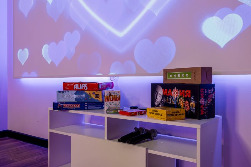 Лаундж-зона с мягкими пуфами и столиком — идеально для отдыха, кальяна или настольных игр